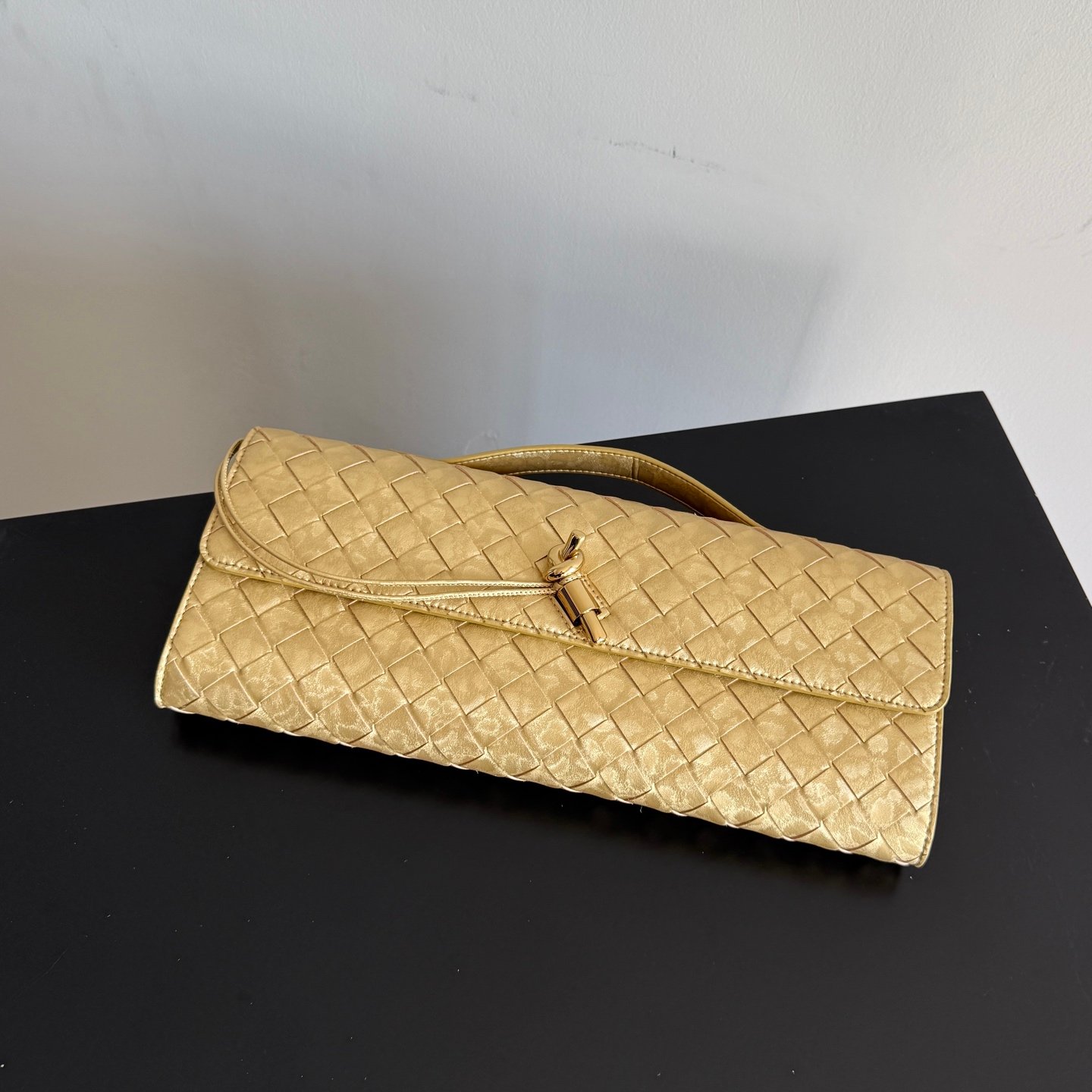 Clutch de piel Intrecciato con asa superior y cierre de nudo metálico