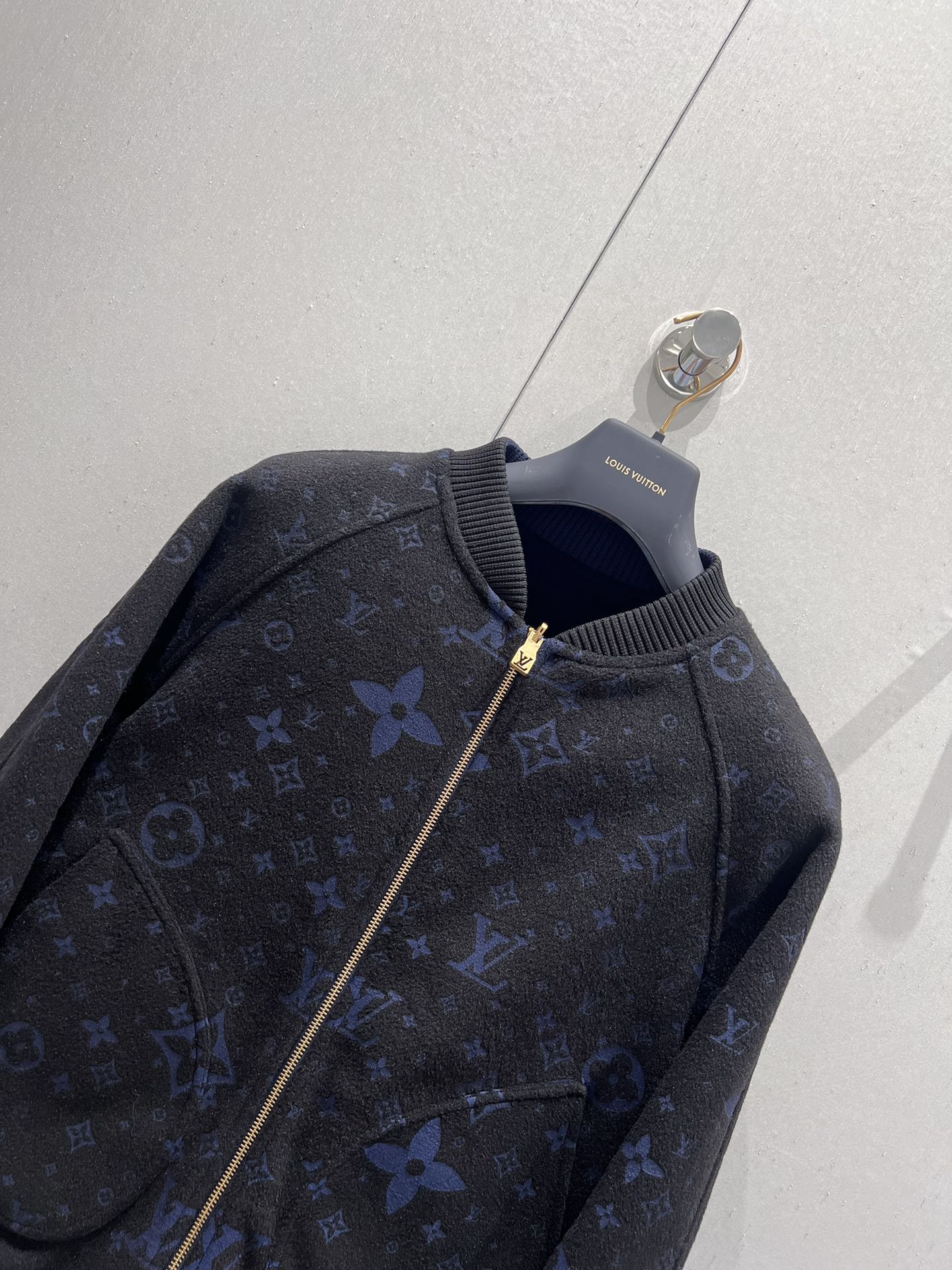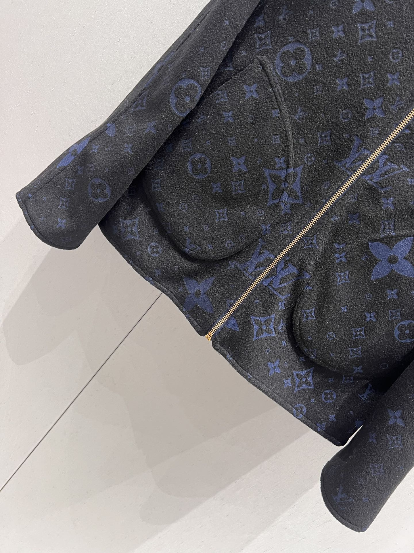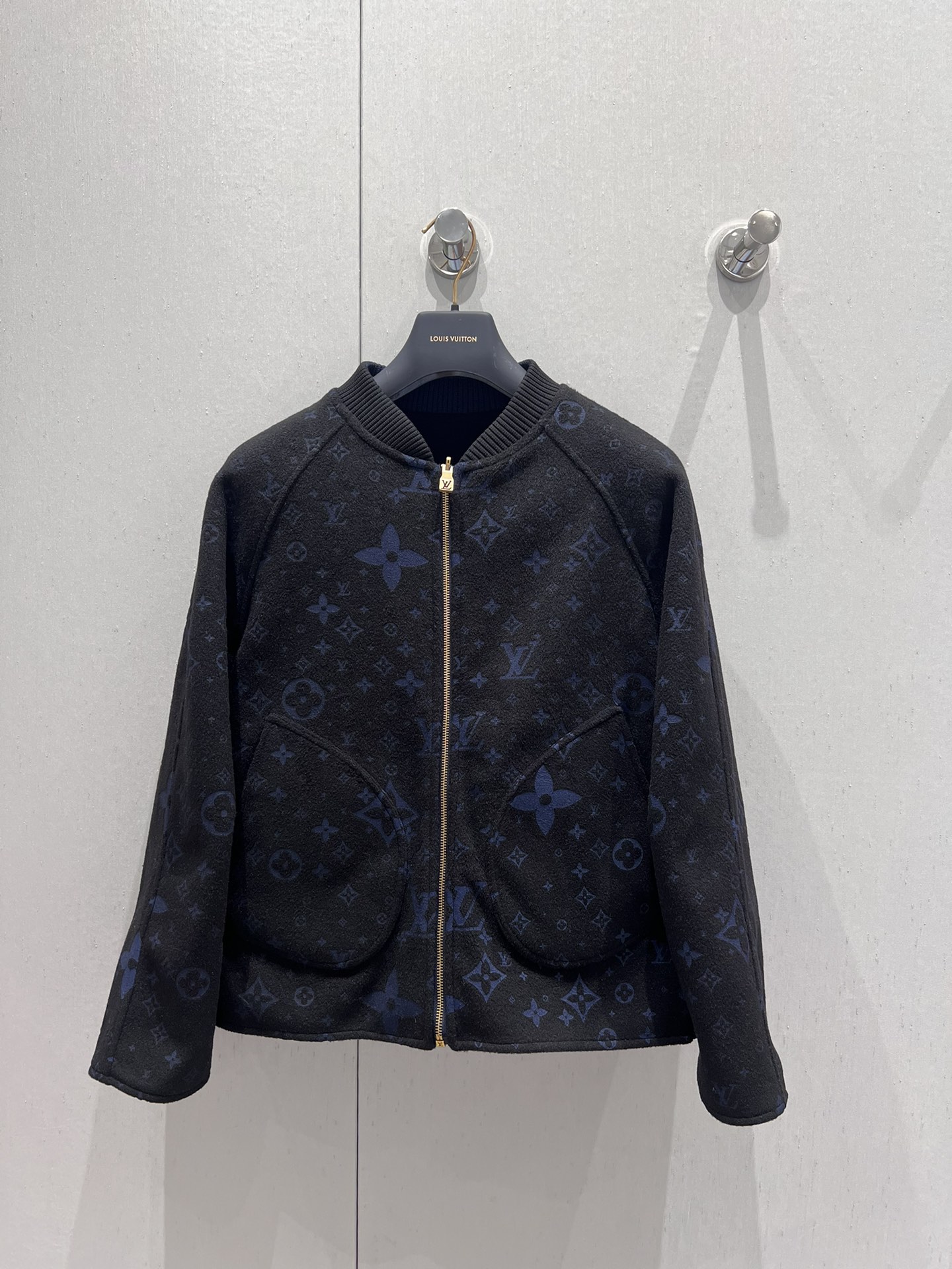 La prenda presenta un cuello de punto elástico, bajo y puños de tejido Monogram y un cierre de cremallera doble con un ribete de punto en la cara estampada.